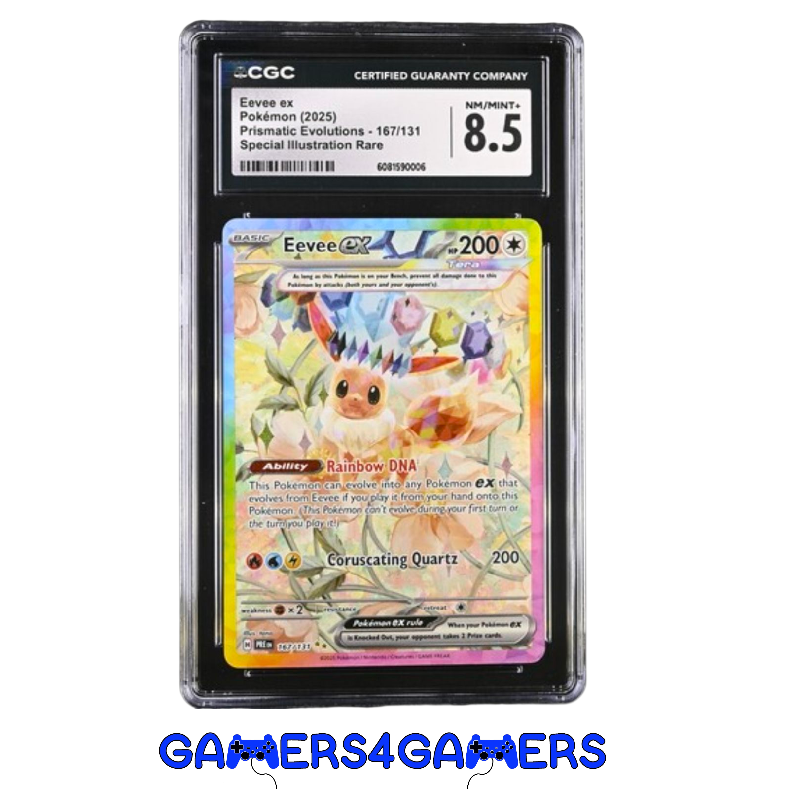 Eevee ex Prismatic Evolutions 167/131 CGC Near Mint/Mint+ 8.5 Graded Pokemon Card Special Illustration Rare from one of the best Pokemon set ever. A card all Collector love from within Prismatic Evolutions making this a very rare card. Eevee ex Special Illustration Rare a beautiful addition to any collection.