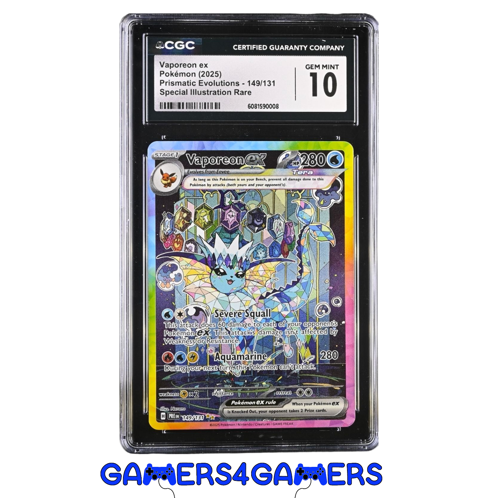 Vaporeon ex Prismatic Evolutions 149/131 CGC Gem Mint 10 Graded Pokemon Card Special Illustration Rare from one of the best Pokemon set ever. A Set all Collector love Prismatic Evolutions making this a very rare card. Vaporeon ex Specail Illustration Rare a beautiful addition to any collection.